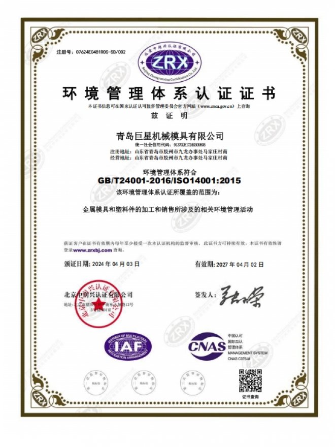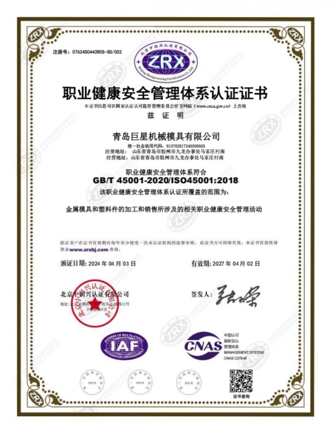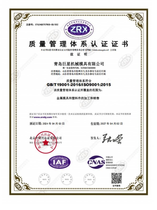 青島巨星機(jī)械模具有限公司位于美麗的膠州灣畔——青島市膠州市。成立于1995年。多年來(lái)一直致力于塑料模具,金屬?zèng)_壓模具,橡/硅膠模具,板片材擠出模具等模具的研發(fā)制造,并且配有塑料制品標(biāo)準(zhǔn)化生產(chǎn)車(chē)間,90T-800T各型號(hào)注塑機(jī)齊全,可為您提供模具研發(fā)與產(chǎn)品生產(chǎn)一站式服務(wù),本司已通過(guò)ISO9001質(zhì)量管理、ISO14001環(huán)境管理、ISO45001職業(yè)健康安全管理等體系認(rèn)證。目前已與美國(guó)通用汽車(chē),韓國(guó)大宇造船、現(xiàn)代重工,俄羅斯,巴西,非洲等國(guó)家或地區(qū)的實(shí)力公司建立長(zhǎng)期合作關(guān)系。